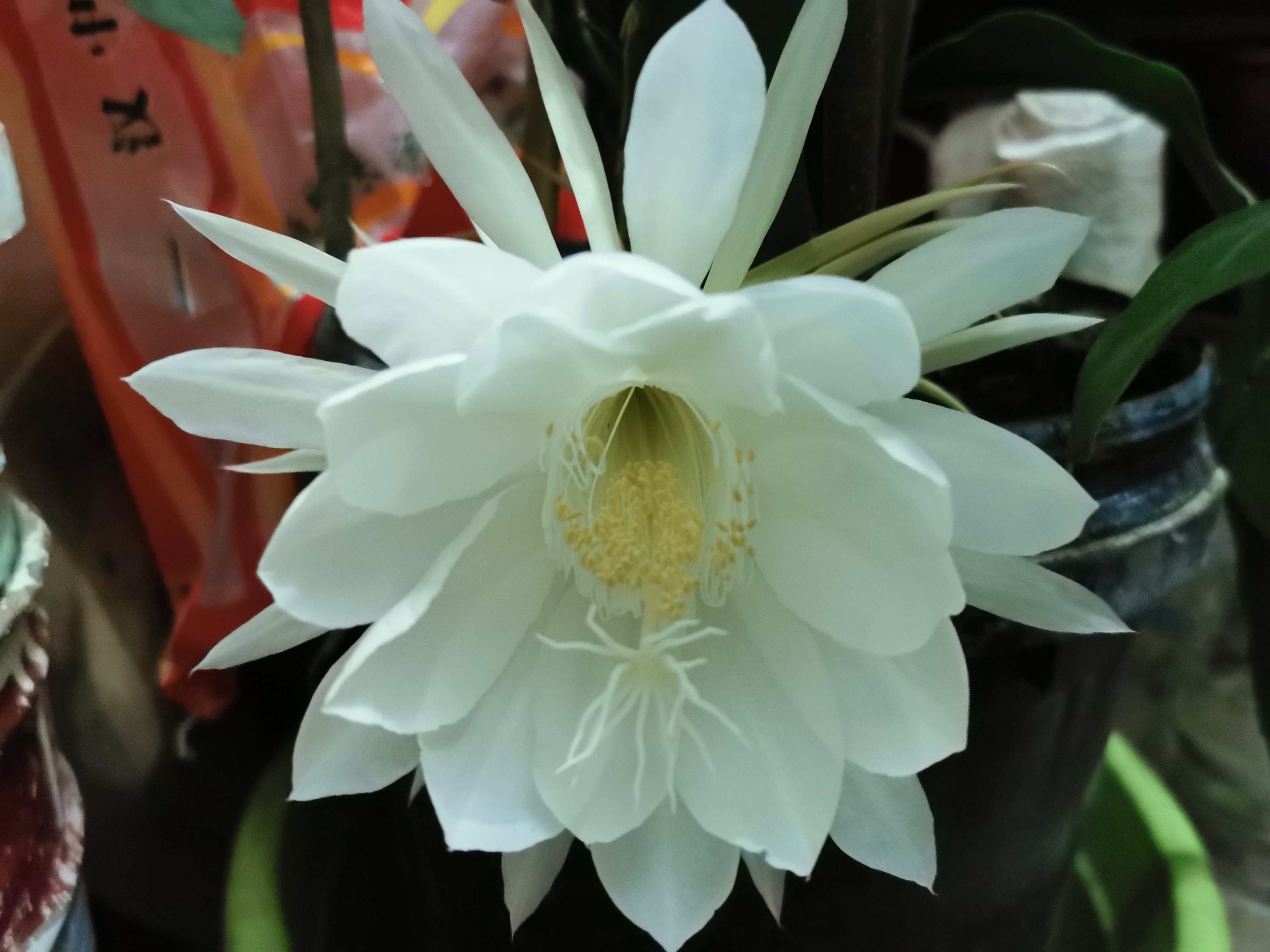 9月深夜,阳台边,父亲种的昙花开了。晚上10点过,终于盛开。手机对阵,卡卡拍了几张,只有这张稍好,留作纪念。一个小时后,花瓣收拢,好似焉了一样,开了3朵,昙花也是可以食用,父亲已经把另外两朵摘了。说要给留给小娃吃。